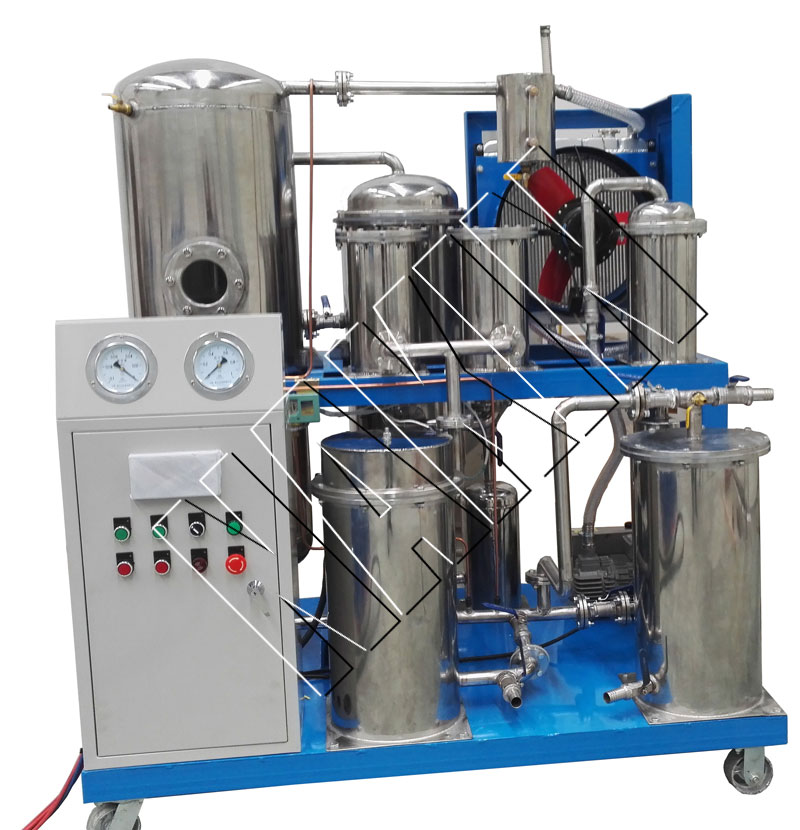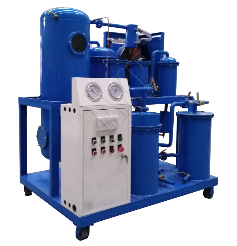 液壓潤滑系統(tǒng)中水的存在會引起油液氧化,使油液變質(zhì),減小油膜厚度,降低潤滑性,引起油液變性聚合而形成大分子,使油液粘度改變,形成有機(jī)酸,進(jìn)而腐蝕金屬表面,降低或喪失油液的品質(zhì)。傳統(tǒng)的聚結(jié)式濾油機(jī)只能脫出含水量較大的油品,用于對含水指標(biāo)要求不太高的油品凈化處理。而將聚結(jié)式濾油機(jī)與真空濾油機(jī)相結(jié)合,在處理含水量大的油品時(shí)聚結(jié)脫水流程先將油中大量水分去除,使油中含水量下降到國家標(biāo)準(zhǔn)范圍以內(nèi),再經(jīng)過真空分離器快速除去油中的微水。與傳統(tǒng)的聚結(jié)分離式濾油機(jī)或單一的真空濾油機(jī)相比較,屬于改良換代產(chǎn)品??捎行コ鸵褐械念w粒雜質(zhì)和乳化水,游離水,而不損害原油品的品質(zhì)。對于含大量水分的油液,其分離效果尤為顯著。